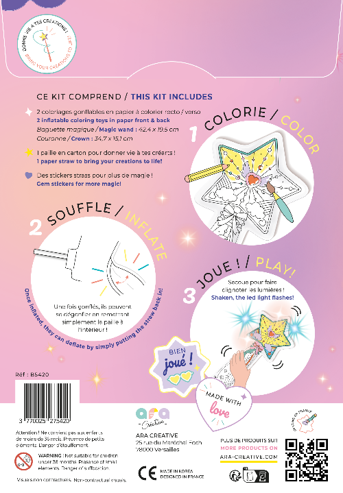 Opblaasbare kleurplaten van het Franse merk Ara créative. Doormiddel van een bijgeleverd rietje kan je deze kleurplaat opblazen en weer leeg laten lopen voor hergebruik voor eindeloos plezier.