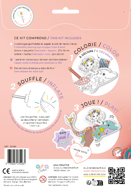 Opblaasbare kleurplaten van het Franse merk Ara créative. Doormiddel van een bijgeleverd rietje kan je deze kleurplaat opblazen en weer leeg laten lopen voor hergebruik voor eindeloos plezier.