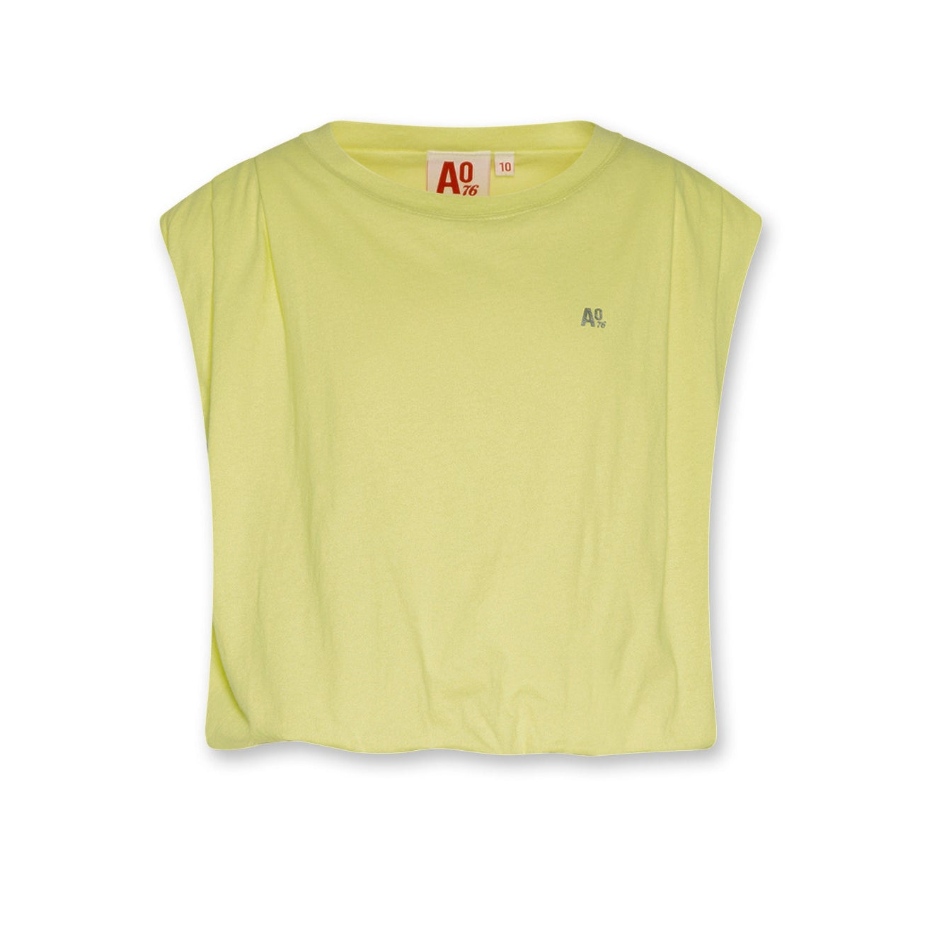 Mooie top van AO76. Cropped model wat naar binnen valt alsof het lijkt dat het shirt in je broek valt. De top heeft plooitjes op de schouder en schoudervulling.