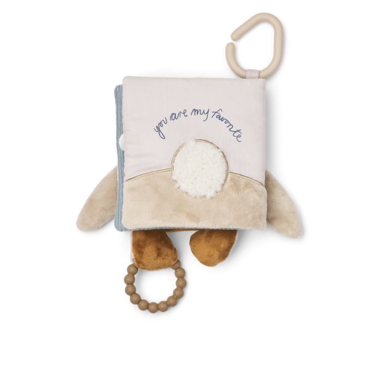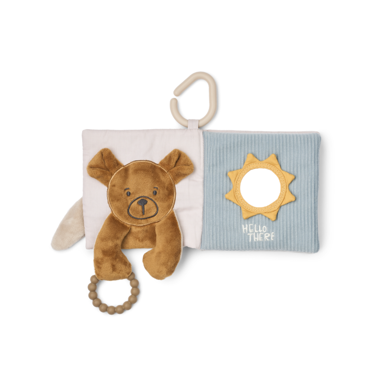 Extra zacht pluche stoffen boek. Gemaakt van 100% gerecycled polyester. Versierd met een schattig konijntje op de voorkant met aangehechte oren en een klein staartje op de achterkant. Met speelse en tactiele elementen voor de baby om te ontdekken. Een aangehechte siliconen bijtring. Inclusief spiegel en knisper stoffen voor zintuiglijke speeltijd.