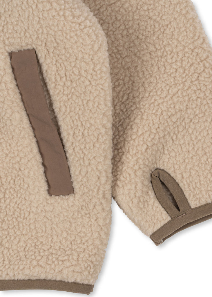 Deze jas van Konges Sløjd heeft een zachte fleece kwaliteit. De jas heeft een hoge kraag met een rits sluiting om deze gemakkelijk aan- en uit te trekken. Ook heeft de jas onder aan de mouw duim gaten waar je duimen doorheen kan doen voor extra warmte.