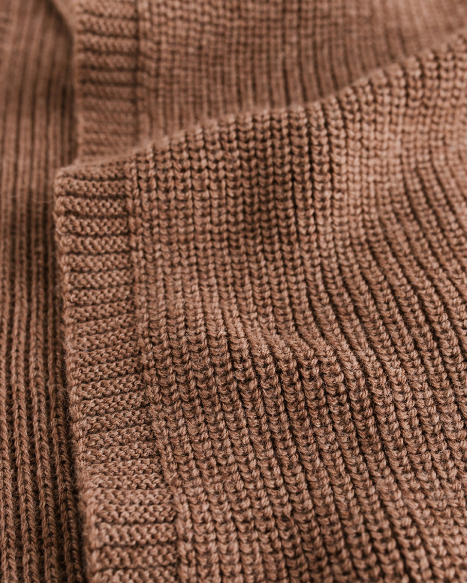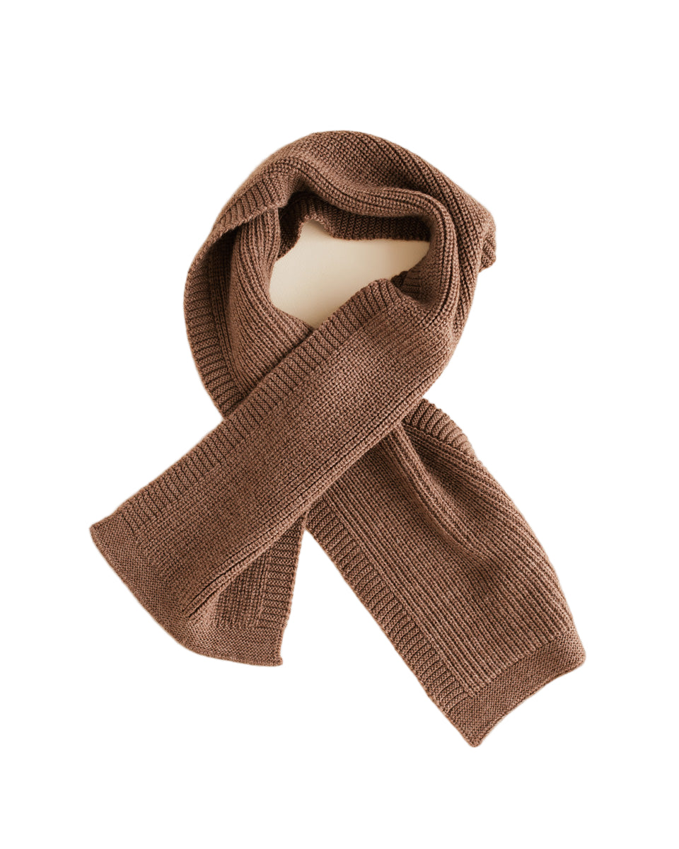 Een sjaal van HVID met ribstructuur, afgewerkt met een averechtse steek aan de zijkanten en gemaakt van zachte merinowol. Perfect voor de winter om je kleintje heerlijk warm te houden.