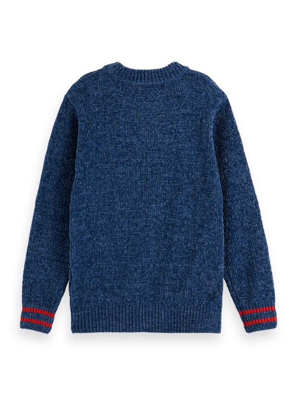 Heerlijke zachte trui in het donker blauw met rode accenten van Scotch & Soda.