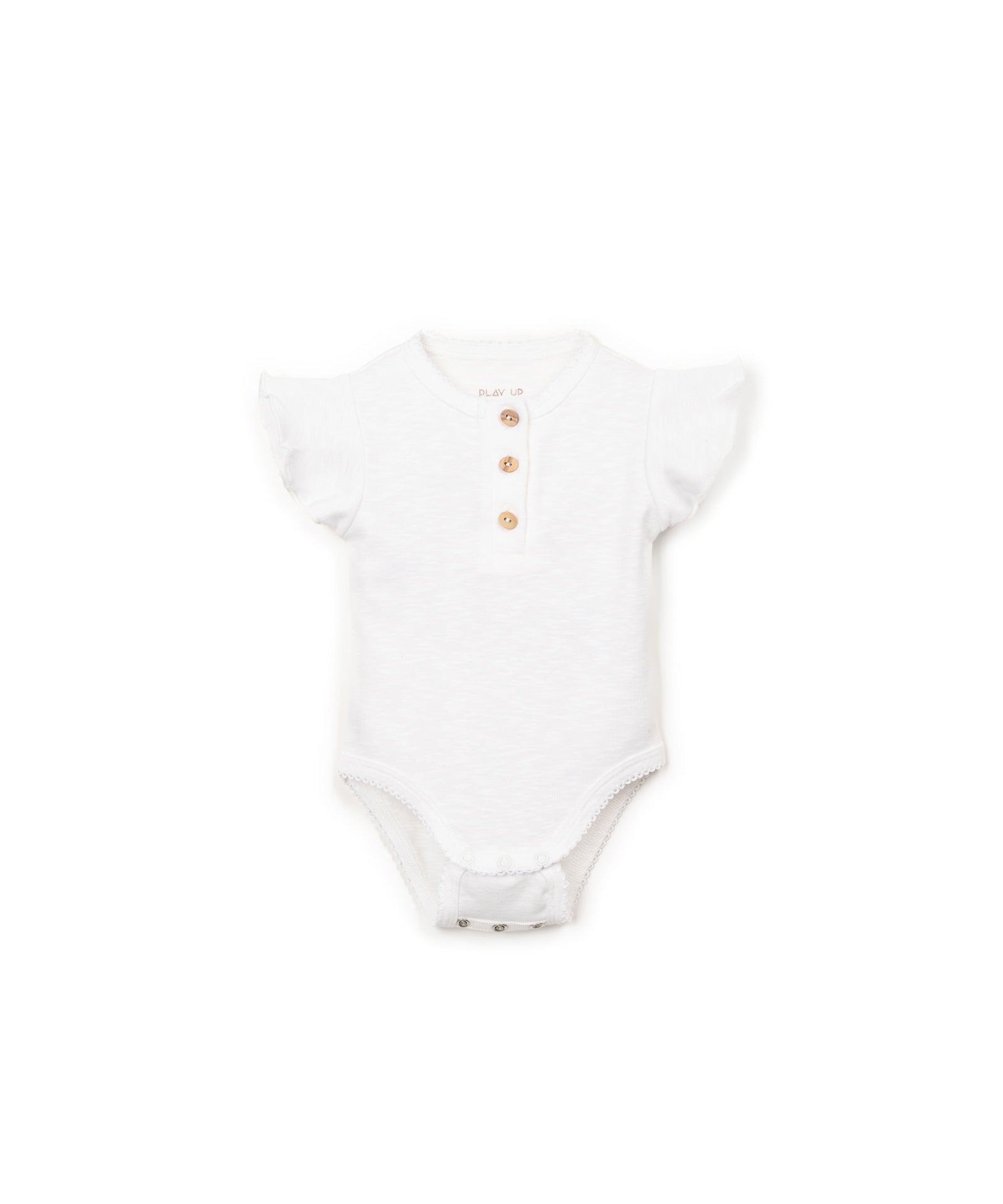 Mooi rompertje met een ruffle mouwtje van het merk Play Up. Er zit een dubbel knoopsluiting onderin om langer plezier te hebben van de maat.