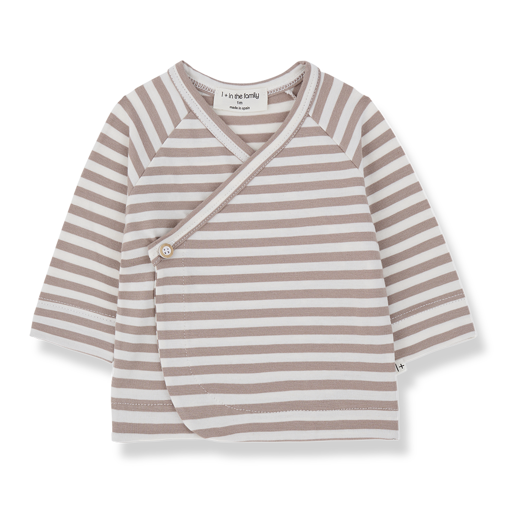 Mooi newborn unisex overslag vestje in een bruin/wit streepje van het merk 1+ in the family. Evt. te combineren als set met de Saul legging.