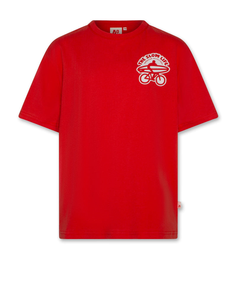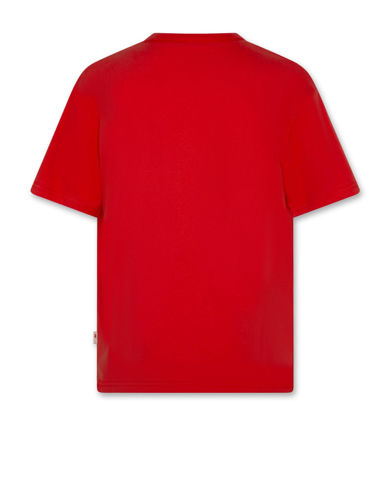 T-shirt in en prachtige rode kleur, print op de borst en zachte katoenen kwaliteit van AO76.