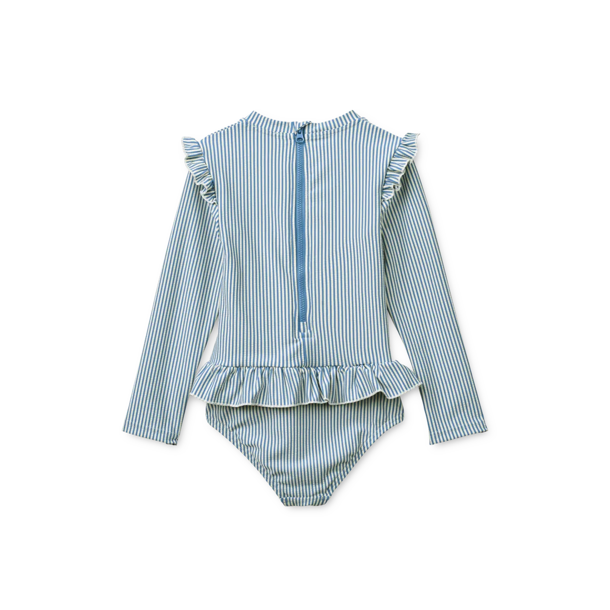 Badpak met lange mouwen, elegante ruches en UV40+ bescherming. Gemaakt van sneldrogende seersucker-stof met GRS-certificering.