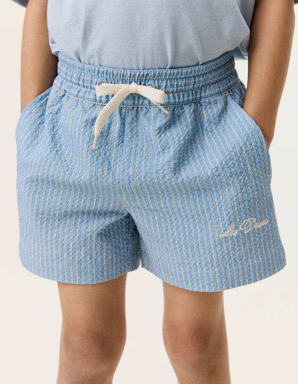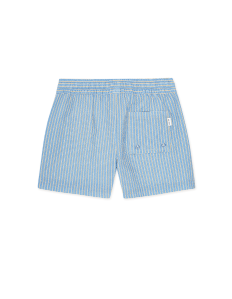 Seersucker zwem short in het licht blauwe met een fijn streepje en strik sluiting van het merk Les Deux.