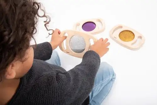 Tickit® Easy Hold Glitter Panel is gemakkelijk vast te houden frames van massief rubberhout met handvatten, waarin verschillende kleurrijke, sprankelende glitterinzetstukken zitten die uw kind helpen om op een unieke manier met de wereld om hem heen om te gaan.